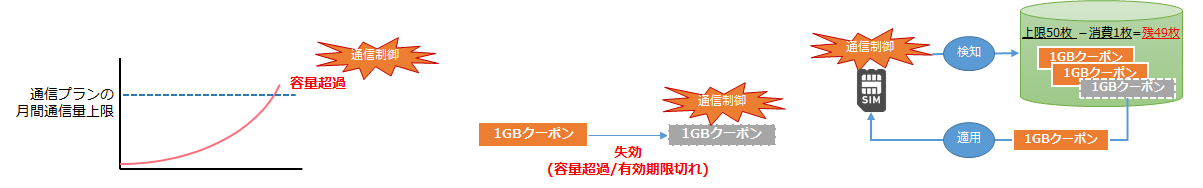 「月間通信量超過」や「クーポン適用/失効」、「通信停止/再開」などの各事象をトリガーとして検知します。それに対応する、「メール通知機能」「クーポン自動適用機能」などSIMグループに紐づく機能と、全トリガーをログとして記録する機能がトリガーアクション履歴です。