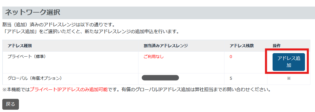 ※グローバルIPアドレスはカスタマーコンソールからは追加できません。専用の申込書が必要なため、問い合わせフォームよりお問合せいただくか、営業担当へお申し出下さい