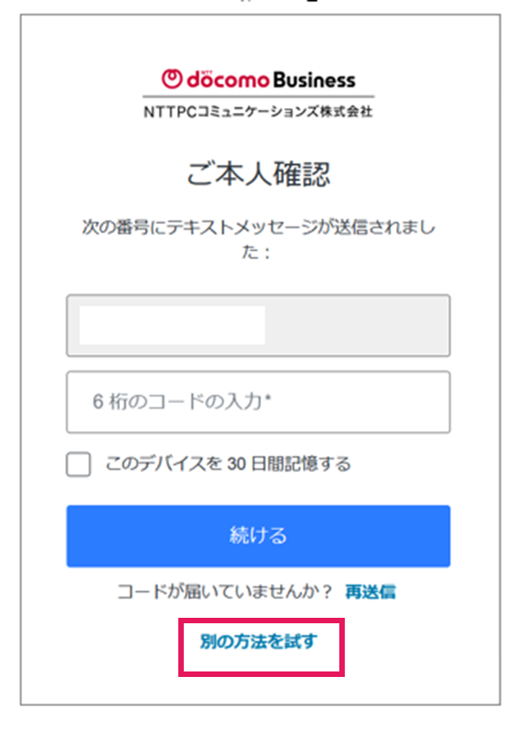 ➁SMS認証コード入力画面で「別の方法を試す」を押下します。